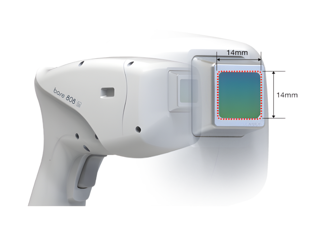 The BARE 808 system offers a 14mm x 14mm spot size, ideal for treating all areas of the body.